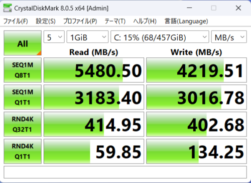 CrystalDiskMarkはストレージの読み書き速度を計測するベンチマークテストです。